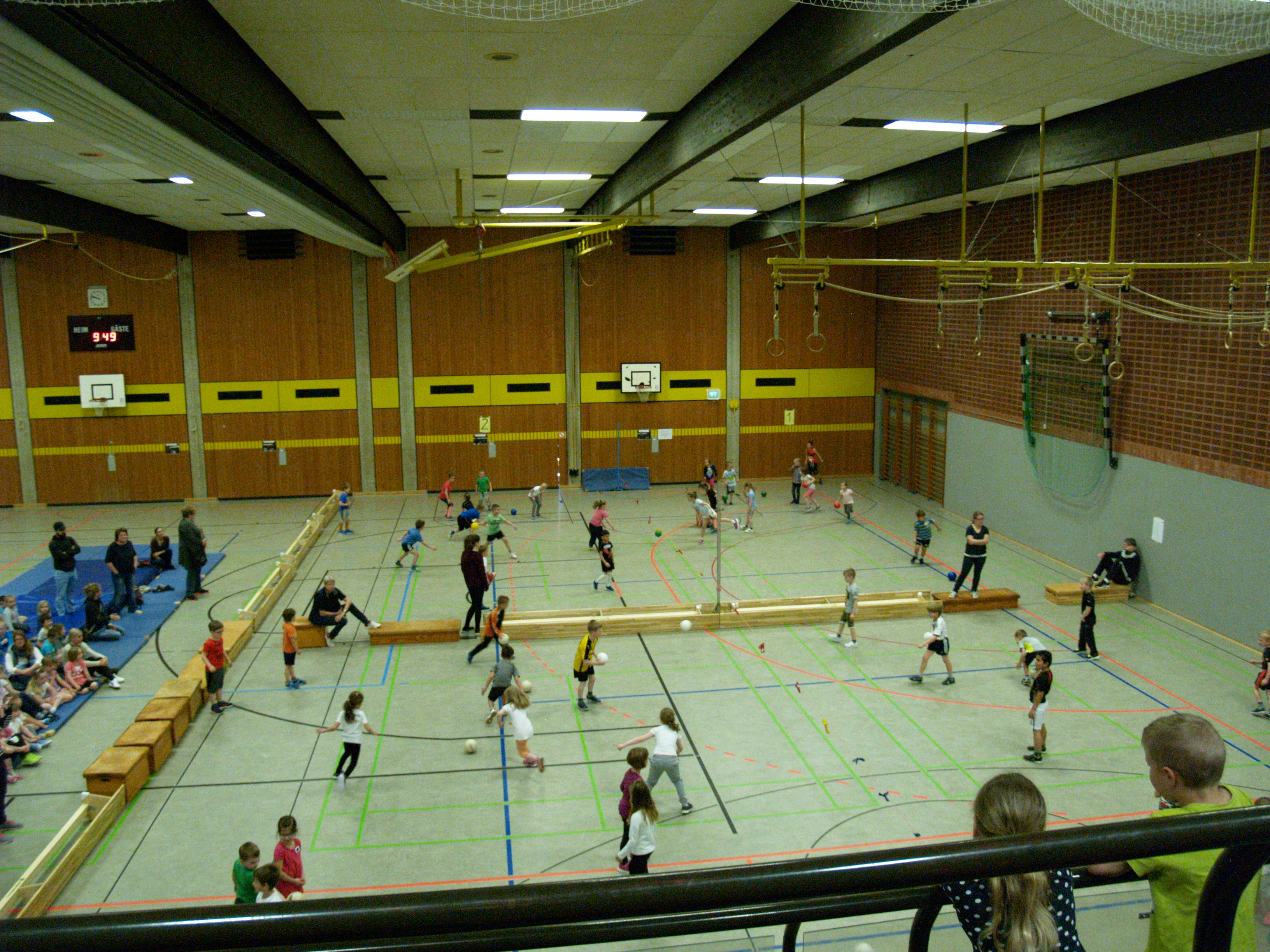 Heute fand das alljährliche Völkerballturnier in der Hindenburghalle statt. Alle 3. und 4. Klassen unserer Schule haben daran teilgenommen. Die Schüler und Schülerinnen hatten wie jedes Jahr viel Spaß und haben ihre Klassenkameraden super von der Tribüne aus angefeuert. Auch viele Eltern haben sich das Spektakel von den Rängen aus angesehen.
